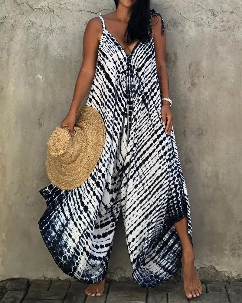 【Ship in 24 hours】Tie-Dye Print Irregular Hem Design Casual Jumpsuit